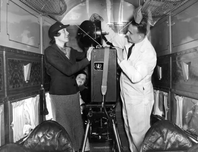 1950年代,工作人员正在一架联合航空的飞机上调试电影放映机。