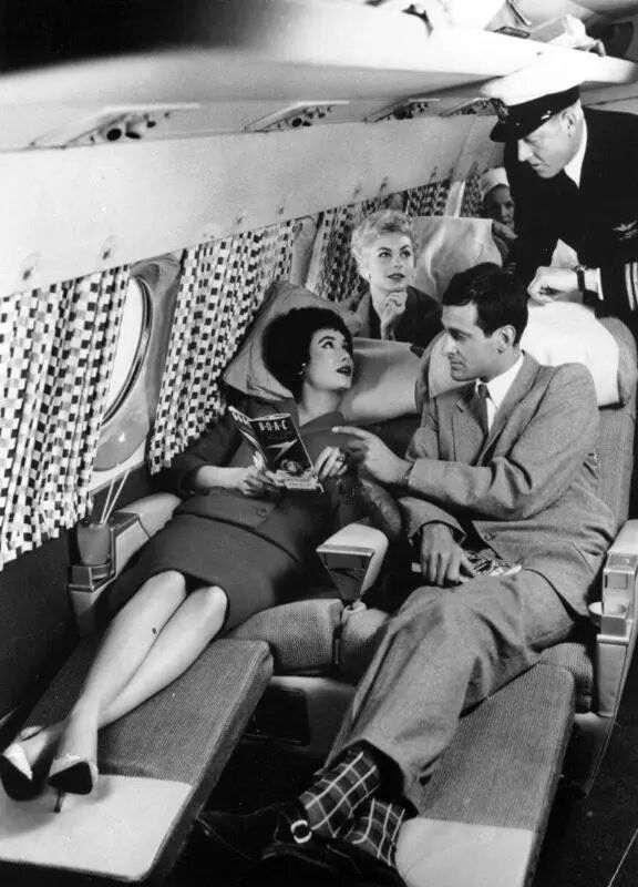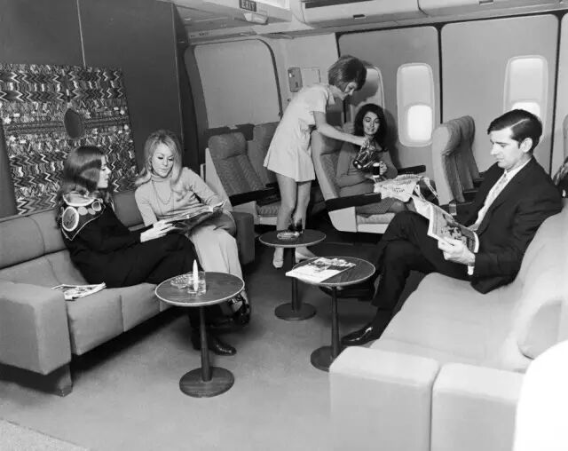 1960年代末,布兰尼夫国际机场的一架航班上,乘客正在沙发区域休息。