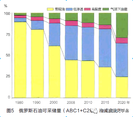 从分布看,西西伯利亚盆地超过一半的探明可采储量(ABC1级)为低渗透储量(渗透率<0.05 md)。乌拉尔-伏尔加盆地约一半的探明可采石油储量含硫量>2%,蒂曼-伯朝拉盆地约40%的探明可采储量(包括大陆架)为高黏度重油。