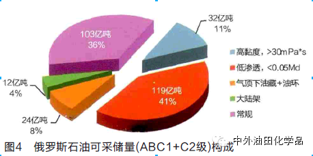 在 俄罗斯的石油可采储量结构中,难采储量(按照俄罗斯的难采储量标准,黏度>30MPa/s、渗透率<0.05md、储层厚度<2米)迅速增加,常规储量大 大缩减。根据俄国家储量平衡表数据[7],截至2012年1月1日,在全俄石油可采储量(ABC1+C2级)中,难采储量占60%(175亿吨),其中 41%为低渗透储层(119亿吨),11%为高黏度油(32亿吨),8%为气顶下油藏+油环储量(24亿吨)(见图4)。