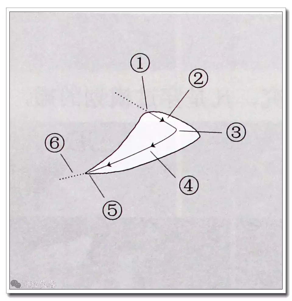 3.驻锋后行笔,先慢渐行渐按,渐渐加速; 4.行之适当位置,渐行渐提,并加速撇出;