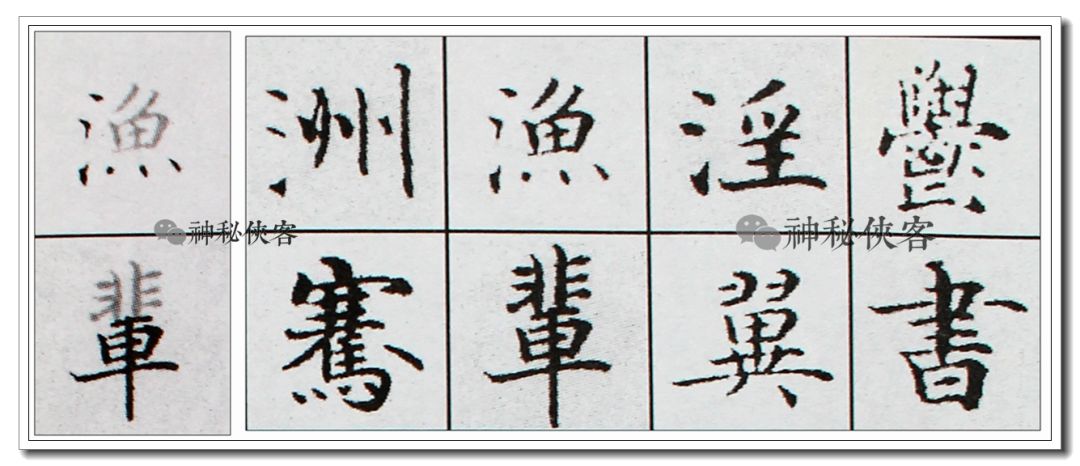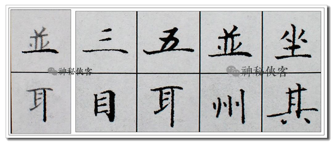 左右两部分笔画相同或接近的字,左面宜略小、略斜、取收势,右面宜略大、略正、取放势,左大右小。上下两部分笔画相同的字,上小下大,上收下放。
