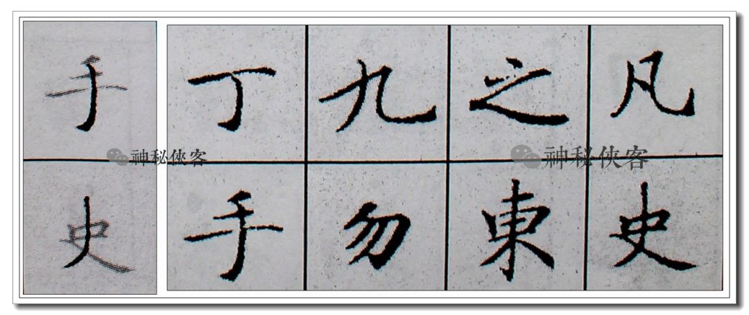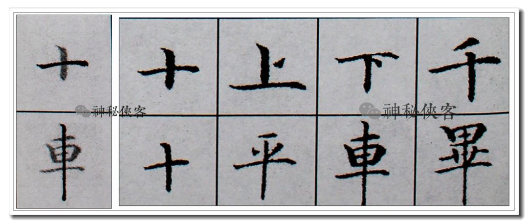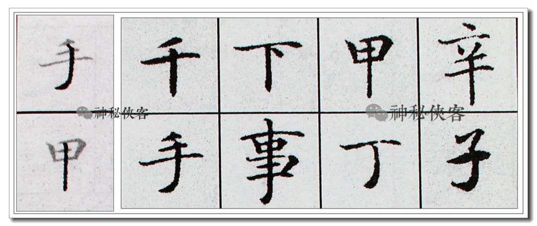 有些字通常以一笔来支撑整体,它必须写得端正挺拔,不可歪斜,犹似“柱子”。如“千”“下”“甲”“辛”字中间的竖画,“手”“事”“丁”“子”字当中的竖钩。