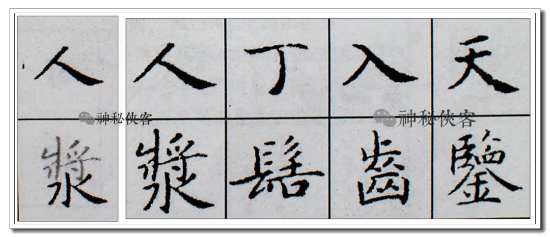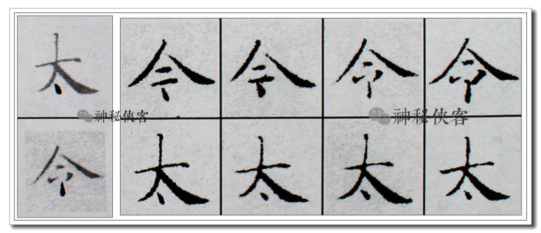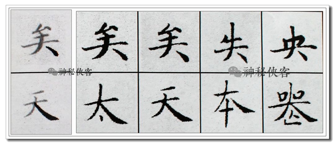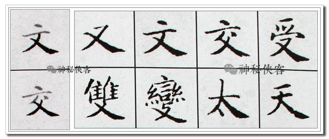 如“文”“交”等,撇和捺交叉的字,撇宜短,取收势;捺宜长,取放势。撇捺交叉点对应上部的正中,左右偏向不可太大。