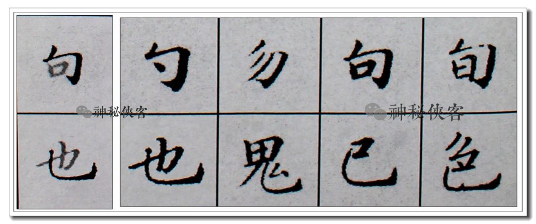 “勺”“勿”“句”“旬”等字,向左勾抱,“也”“鬼”“已”“色”等字,向右勾抱,要能托抱住上方笔画。凡勾抱不可太宽,太宽则松散;也不能太紧,太紧则局促。应婉转勾环,宽紧适中。
