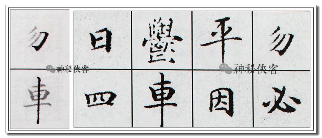 字有笔画少的,如“日”字,有多的,如“郁”字。结体有方的,如“因”,有圆的,如“必”字,有扁的,如“四”字,有长的,如“车”字,有正的,如“平”字,有斜的,如“勿”字。笔画少的,字形宜略小,笔画多的,字形宜略大,不可把笔画少的字写成和笔画多的字同大。也不可把字形长的写成短的,短的写得太长,正的写成斜势,斜的写成正的。总之要随各自的原有体势去写。
