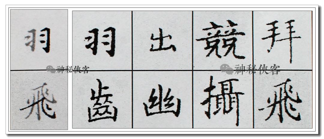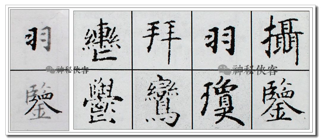 笔画多的字,要写得茂密、匀称,勿使松散杂乱,密处相犯,疏处相离。前人常用“排叠”的方法来处理,“排”是使笔画密处疏通,“叠”是使笔画疏处茂密。如“羽”字中“习”字须分布匀称、整齐,“鉴”字上下、左右各占位置,须互不相害。