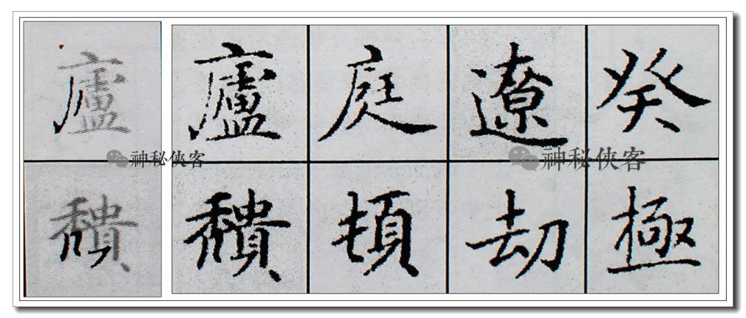 “庐”字有两撇,外面一撇用回锋,里面一撇就不能用回锋,下尖。外面一撇取收势,里面一撇取放势。同一个字中,上下有捺,一捺取收势,写成反捺,另一捺取放势,宜长。“极”字右下一横本短,写成长横便能承托上面部分。“颓”字“几”部弯钩为避右部,则缩短,“劫”字“刀”撇本短,伸至左下,相抱持。