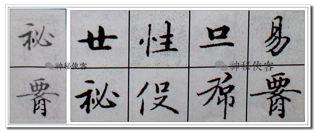 有些字,两笔画位置及形态笔势都相近,往往省去其中一笔。如“秘”字,“示”的右下一点和“必”的左下一点相近而破省去,留着的为左右共用,前人称这种方法为“借”。有些字可调换位置,以便于搭配,如“腰”字,左调下,前人称之为“换”,但这绝不可随意滥用,是约定俗成的。这种方法现在不多用。