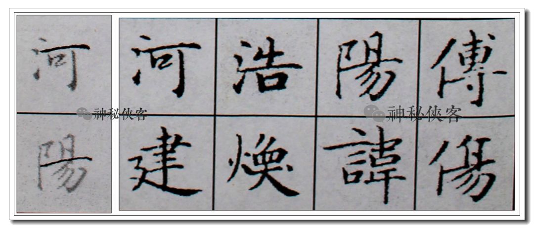 几个部分组成的字,为使本来分散的笔画连贯,体势茂密,令其上下左右呼应,可用“牵搭”法。如“河”字,中点和左上横相牵搭,“阳”字,右长横和左边耳旁的竖牵搭。