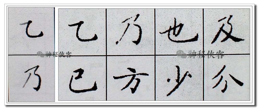 体形偏侧的字较难写好,要斜中求正,补偏救失,体虽宜斜而字心必正。如“也”字的横折钩,“乙”“已”的竖弯钩,“乃”“及”的横折折钩,都不能写得太正。一个字既要把握住重心,还要将非重心部分的笔画安排好,做到均衡协调,否则,仍会出现轻重倒置、左歪右斜的现象。