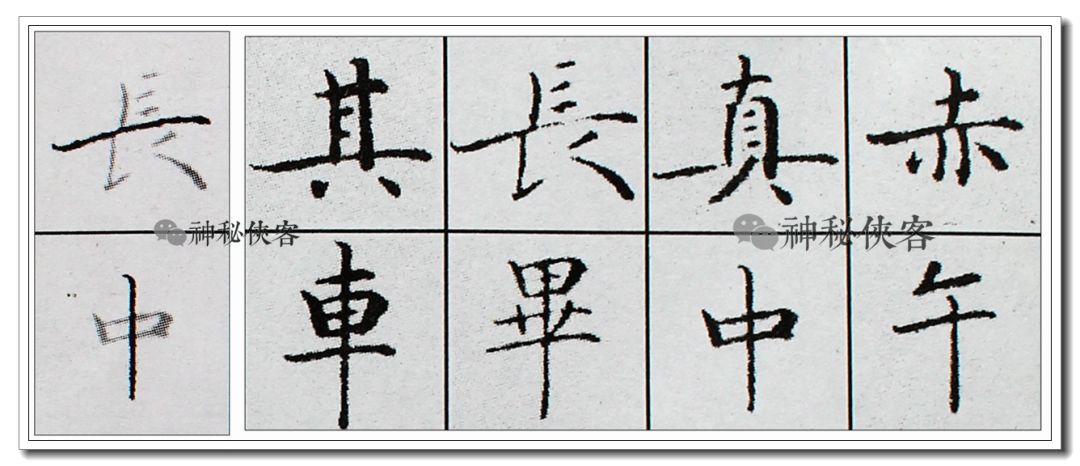 有些字,中间横画宜长,其他横画宜短,这样就有了主次之分,使笔画不致混乱。长横在这个字中起着统率作用。有些字,中间的竖画要写得长,其他竖画可写得短些,长竖在字中同样起着统率作用。