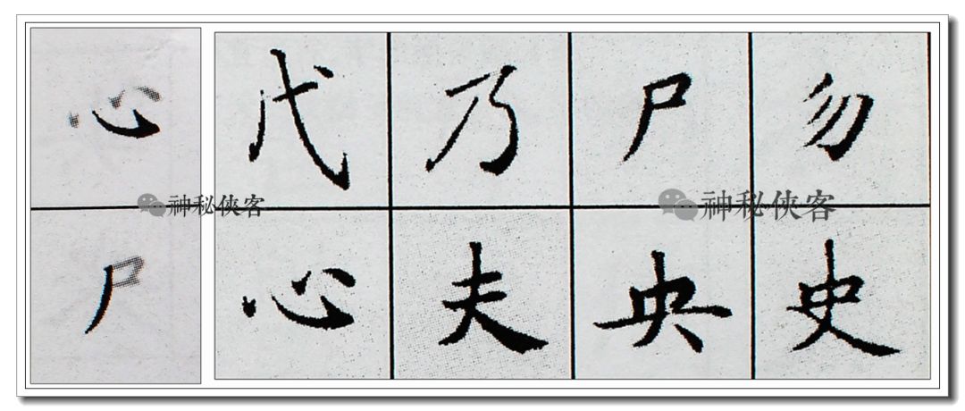 有些字的结体,原是偏向右的,就应随其向右之势写去,如“心”“戊”二字;有些字原是偏向左的,就应随其向左之势写去,如“乃”“尸”“勿”三字。有些字应当写正的,就不应写得偏侧倾倒,如“夫”“央”“史”三字。