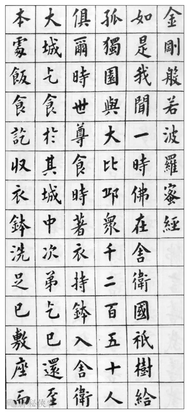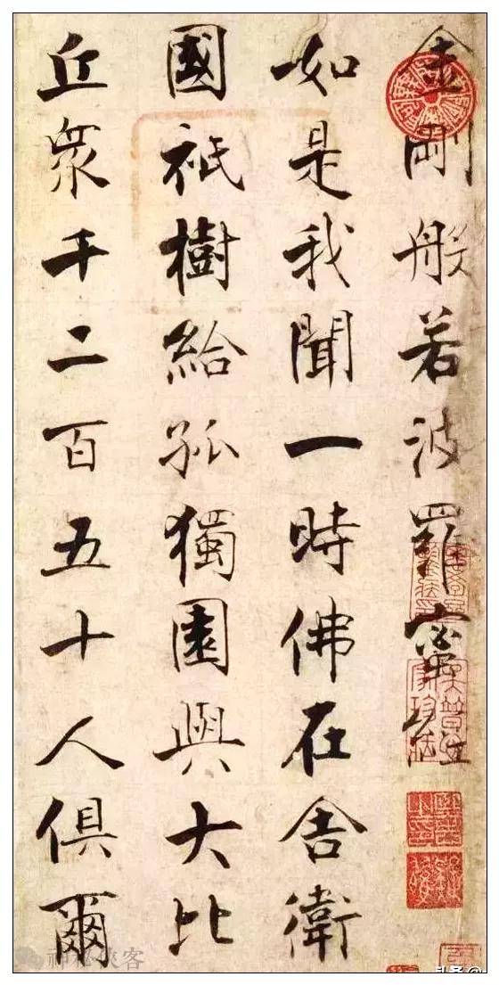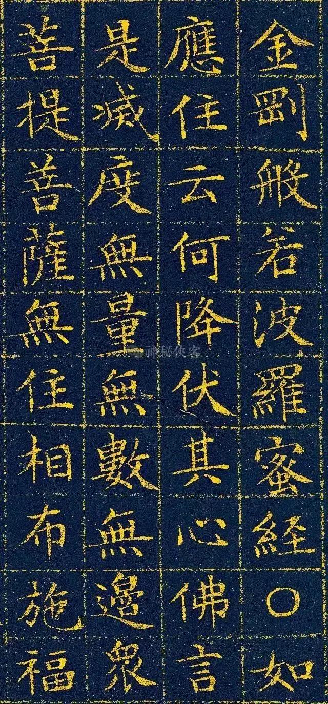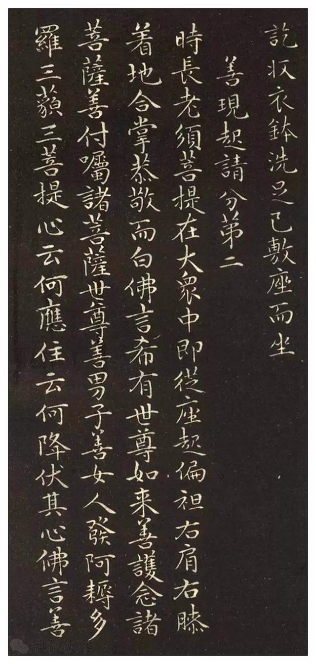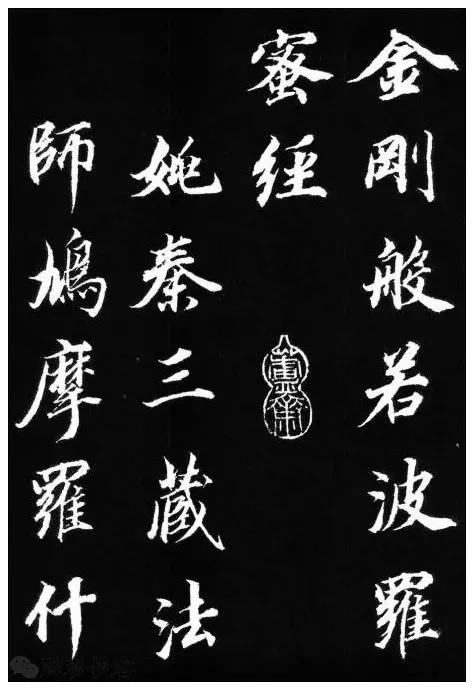 唐代除武宗外历代崇佛,故而士大夫阶层写经作品也很常见,而书写《金刚经》以柳公权最为著名。《金刚经刻石》柳公权正书,刻为横石,共十二块,每行十一字,原石毁于宋。此为柳书早期代表作。其下笔精严不苟,笔道瘦挺遒劲而含姿媚;结体缜密,以纵长取形,紧缩中宫,开展四方,清劲而峻拔。