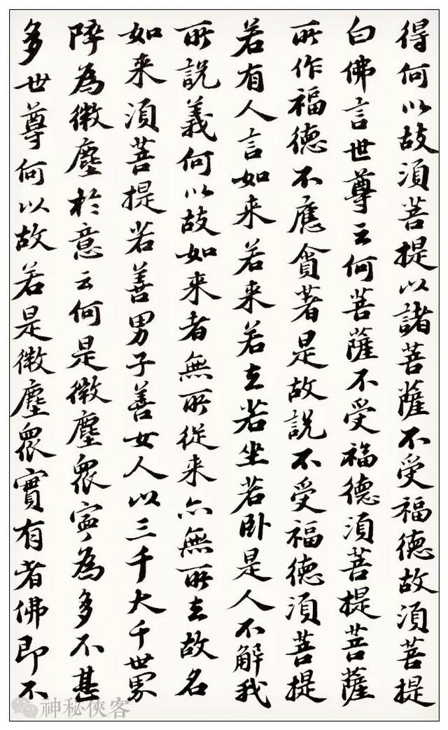 有清一代以翁方纲的《金刚经》最为出色,翁方纲学识广博,对颜书、欧书和唐人写经、汉隶都下过很大的功夫。但他的书法艺术水平并不是很高的。他的书法讲究无一笔无出处,而自己的东西却很少。整幅作品用笔以圆润轻柔为主,没有丝毫方刚急躁的火气,从柔润流畅的笔意中,可推想作者书写时灵活的用腕。综观此作品,运笔沉酣,墨色浓厚,笔划丰满,筋劲骨健,妙得神韵,是他的精品之一。