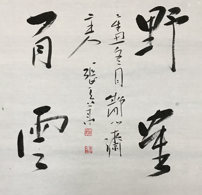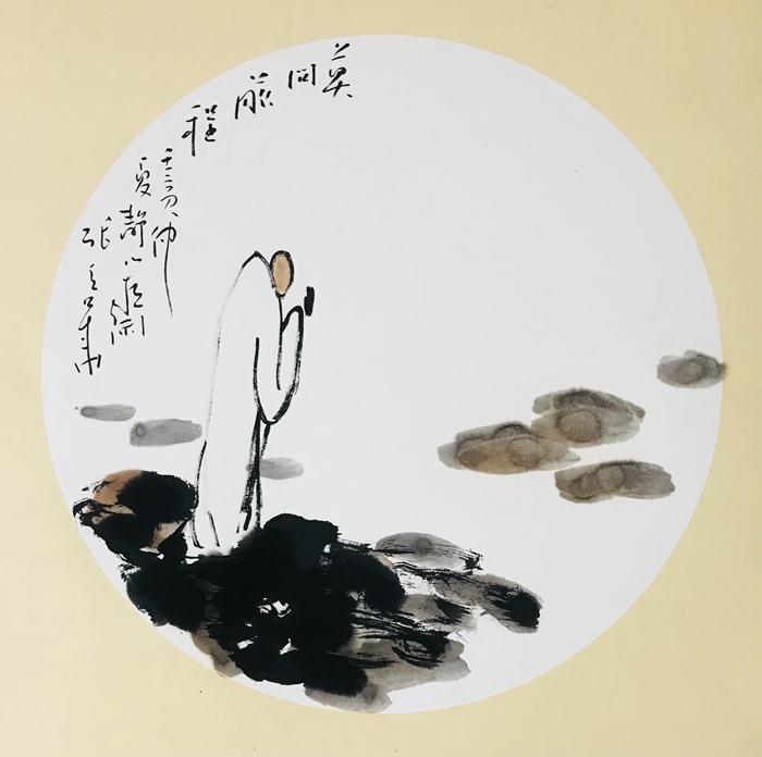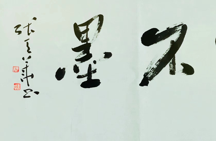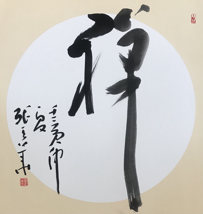 作品欣赏:作品的正文一字仅一笔,能够把书法中的笔法.墨法.章法体现出来,能够表现出书者的整体艺术修为。正文与落款的大小错落.左右倚侧的和谐,让人们感受到作者简入妙的理念。作者把一字写在整幅作品的黄金分割线上,能给人以感官舒适,心旷神怡,理性的愉悦和内心满足的空灵感受。其作品中融入了儒家的坚毅果敢,也蕴涵了老庄的虚淡散远和沉静闲适,在运笔中省去尘世浮华以求空远真味的趣意。其作品体现了作者的形神机趣,境由心生,无我无为,由净入静的修行理念。一即是多,多即是一。