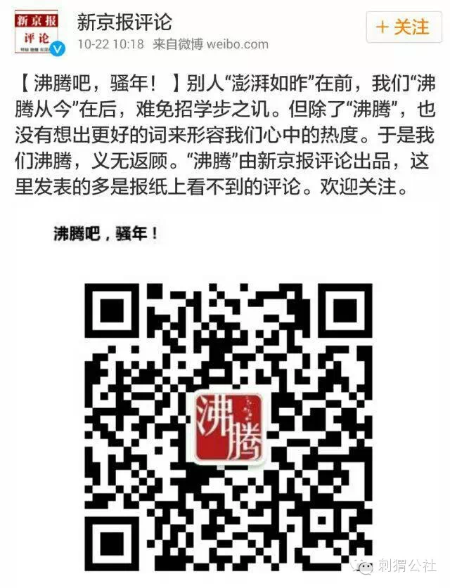 C:评论部已经有一个官微公众号“新京报评论”,为什么还要专门成立“沸腾”呢?刺猬君发现“新京报评论”有一个栏目就叫做“沸腾”,两个公众号是什么样的关系呢?