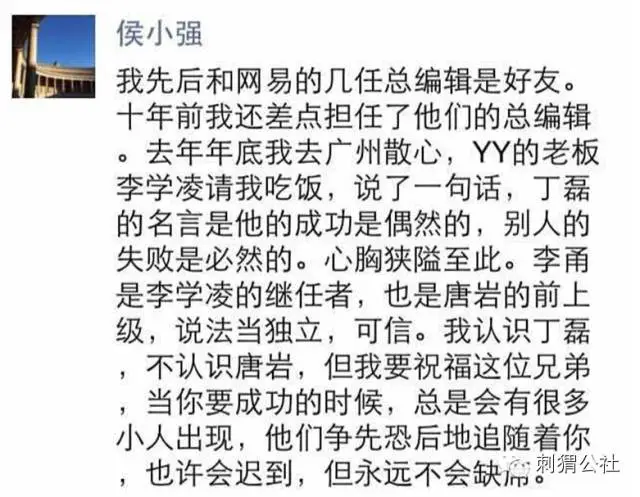 此外,原盛大文学CEO侯小强也在朋友圈透露,原网易总编、现多玩游戏网总裁李学凌对丁磊也有微言,“丁磊的名言是他的成功是偶然的,别人的失败是必然的。”可见其“心胸狭隘”。
