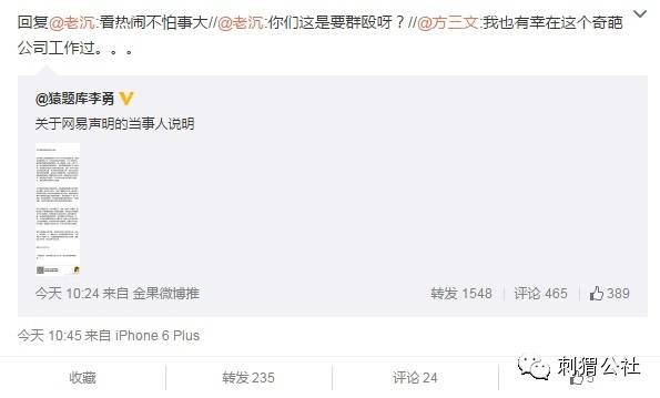 文末,李勇指出:“在如何对待员工和前员工这一标准上,我们碰上了一个奇葩公司。”前网易副总编、雪球创始人方三文对此转发并附议道:“我也有幸在这个奇葩公司工作过。”