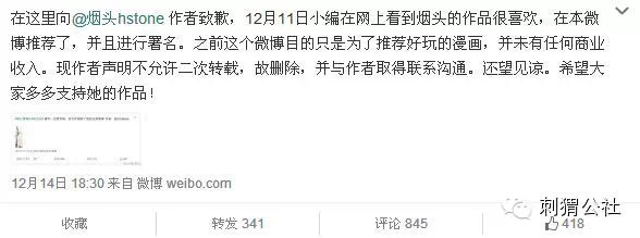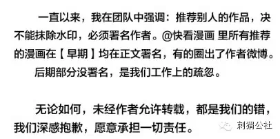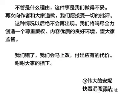 12月15日,@快看漫画又发表微博:“事件经过我已通过官方平台解释,补救措施正在进行,接受大家批评,并致以最诚恳的道歉。”