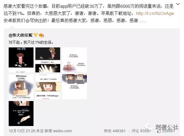 梦想—受挫—坚持—成功,陈安妮用一贯的创作方式讲述了自己的故事,看似普通的心灵鸡汤,却达到了极佳的传播效果——这组题为《对不起,我只过1%的生活》的漫画在微博上一天之内被转发40多万次,微信朋友圈被它刷屏,文末宣传的APP“快看漫画”更是创下了单日30万次下载量的记录,在App Store里高居免费榜榜首。