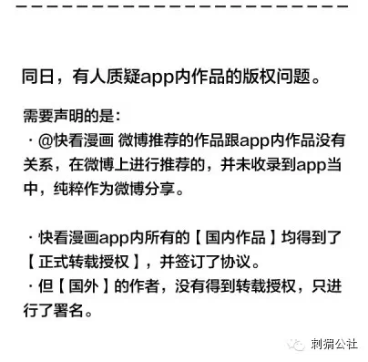 一个是在 App 上快看漫画是12月初上线,12月13日开始宣传,在14日有人指出来这个事情以后就开始清理里面的内容。这里面其实主要是一些海外作者的漫画没有联系过原作者的同意,另外有一些标记的是翻译作者。