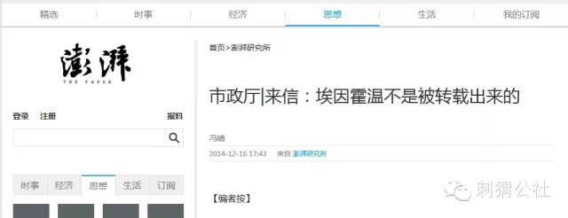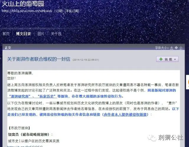 12月24日,@微思客 WeThinker在微博上发起了#澎湃作者联合维权#话题,其微博帐号和微信公号也同时发布了《关于澎湃作者联合维权的一封信》的文章,矛头直指以网易新闻为代表的一批媒体机构在无授权的情况下随意转发刊载澎湃新闻旗下【澎湃研究所-市政厅】、【私家历史】等专栏的文章。