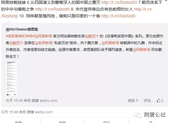 “有态度”的网易倒是风采依旧,对于这群澎湃旗下的作者,在其大佬澎湃新闻表现并不积极的情况下,网易选择了冷处理的方式——删除文章但不作公开回应。可作家们却并不买账,打着“澎湃作者联合维权”的旗号,他们通过自己的渠道@微思客 WeThinker不断发声——继转发@营国匠人的文章后,@微思客 WeThinker从24日下午3:17分开始发布作家联盟中的@酸豆汁被转载的文章列表,要求涉事的@网易新闻和@缅甸在线2013迅速删除文章并道歉。当然,谴责之余依然不忘拉上自己的东家@澎湃新闻。但这次,受谴责的两家媒体的反应就慢了许多,截止写稿前,刺猬君还可以在这两家媒体网站上查到后一份表单中列出来的文章,而网站在文章的作者部分也只是标识了澎湃新闻网。