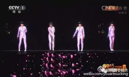 一首《锦绣》动人心弦,还上演了一出“真假李宇春”。春晚剧组利用全息投影技术为她专门制作三维舞台仿真,据说这是羊年春晚造价最高的一个节目。看着下面这场景,有人说其实这是个组合,名字叫“李宇春、李宇夏、李宇秋、李宇冬”……