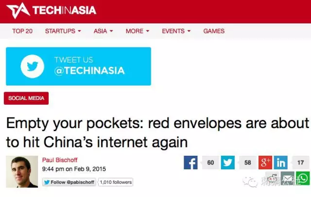 2015年2月9日,记者保罗·比斯科夫(Paul Bischoff)发表了一篇题为《掏空你的口袋:电子红包又要来了》(Empty Your Pockets: Red Envelopes Are About to Hit China’s Internet Again)的文章,从去年微信开始推广红包功能的事情讲起,描述了去年除夕夜微信和支付宝用户在8小时之内发出550万个红包的盛况。