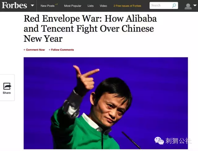 2015年2月19日,农历大年初一,《福布斯》迅速以《红包大战:阿里巴巴和腾讯的中国新年之战》(Red Envelop War:How Alibaba and Tencent Fight Over Chinese New Year)为题对“红包大战”进行了报道。《福布斯》认为中国的羊年是“绵羊(Sheep)年”,其用“疯狂”、“现象级”等词语来形容阿里巴巴和腾讯这次的竞争,描述其如何利用春节进军数百万中国人电子钱包的渠道。