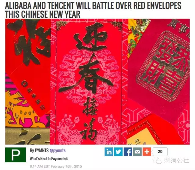 紧接着,PYMNTS.com (What’s Next In Payments) 以题为《今年春节,阿里巴巴将与腾讯展开红包大战》(Alibaba and Tencent Will Battle Over Red Envelopes This Chinese New Year)的文章预测了今年除夕之夜的这场红包争夺战。