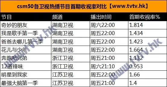 表1. 全国各大卫视综艺节目首播的50城收视(来源:收视率排行榜)