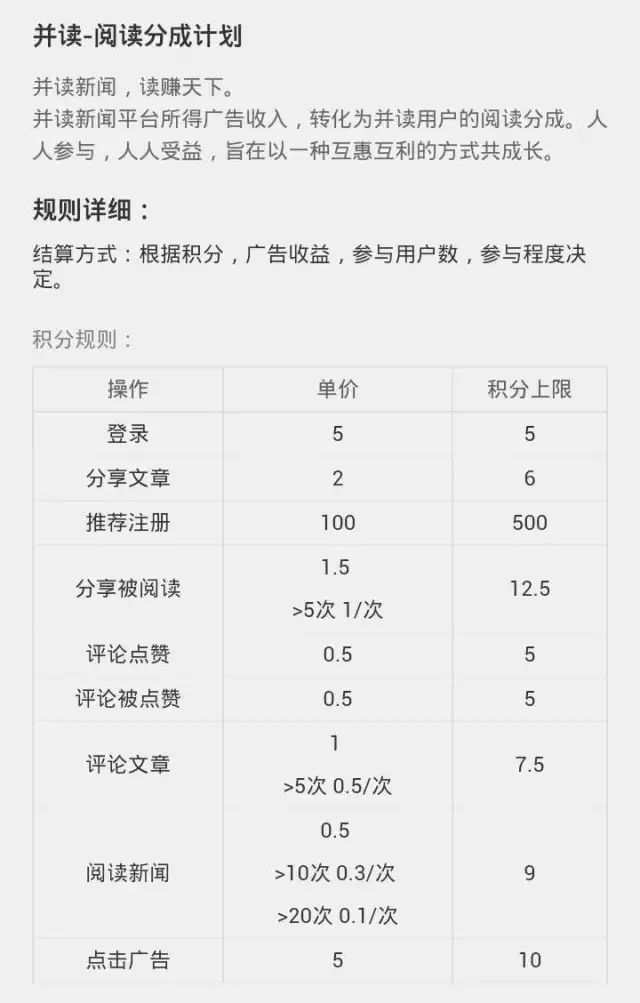 为了带动使用量、加深参与度和增加用户粘性,“并读新闻”引入了“用户分成”的概念。为避免恶意刷分,在积分标准上,其制作团队还加入了许多细节的考量:如阅读文章的积分获取,用户需在一篇文章中停留至10s以上才可视作是阅读行为发生;且每次阅读文章增加的积分数会在达到一定程度后减少,如一开始是每次阅读加0.5分,达到5分后会变成0.3/次,临近极值10分时会变成0.1分/次。