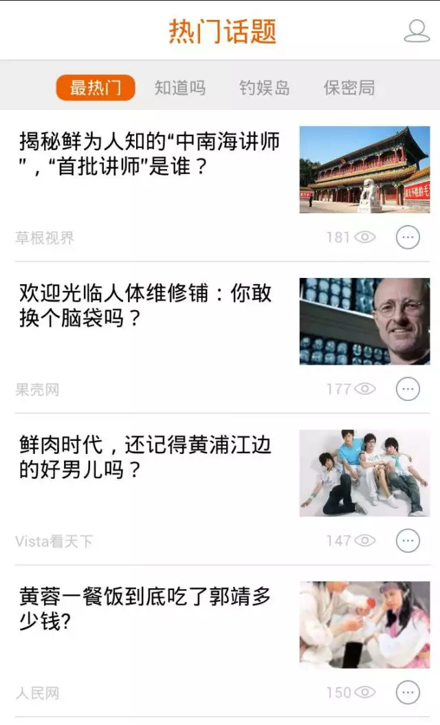 根据官方介绍,“热门话题”将自媒体帐号(也就是各大微信公号)生产的内容作为主要筛选推送对象,之后再分配到四个板块中——“保密局”主打政治官场,“钓娱岛”为娱乐八卦,“知道吗”则将各类冷门知识作为推送对象,“最热门”则是对前三项专题中最为热门的内容的集中推送。