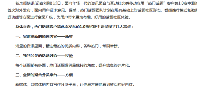 但目前来看,前者的这项功能仍在开发之中,能否做到如今日头条一般,在5s内依据用户连通的社交账号分析其兴趣点,就有待考评了;而产品的另一项主打功能——社交,目前也还在开发之中,根据官方发布的信息中“话题社区形态”的表述,可以推测依托热点话题及文章的用户社区将是一个发展方向:在评论互动的基础上融入社群板块,根据用户对话题的兴趣喜好建立更加细密的社区平台。根据新京报对合作方三胞集团当家人袁亚非的采访来看,三胞这次跨界合作,主要目的在于依托互联网产品导入更多用户流量。由此可见,未来在O2O方面的引入也必将成为“热门话题”的重要功能。