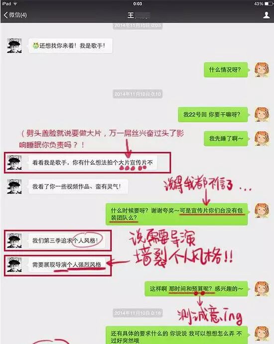 回顾李焉知同王美青的几次聊天协商中不难看出,王抓准了湖南卫视“平台资源”的优势来吸引李心甘情愿地拿白菜价售卖个人创意作品——李在微博上发布《输得漂亮》时提出的主要经济诉求也仅仅是收回自己的成本,可见在这次交易中双方的地位差异;而王在李第一次交上分镜头剧本中所透露出的“我们其实也有一个类似的剧本但已经不打算做了”表明节目组一开始就拥有不止一支团队在准备这次的宣传片,而李的创作更多是作为节目组的一个免费创意储备库,最终的素材可以无偿地进行提取使用。王从一开始可能就已经坐准了利用湖南卫视的节目影响力让李心甘情愿地白打一场工的想法,后来的节目水准不够不过是临门一脚的借口罢了——一个影响力扩展到几亿人的节目,号称终极版的宣传视频就靠一个临时找来的年轻独立女导演,制作期只有短短一个月,这种事真是想想都醉了。