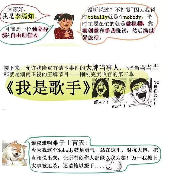 4月12日晚10点,一篇名为《输得漂亮》的文章在微信朋友圈和微博上开始传播,文中曝光了《我是歌手》节目组对某独立女导演所构成的侵权行为。作者李焉知随后在新浪微博开辟了#我是歌手请还钱#的话题板块,截止发稿前,相关微博话题的阅读量已直逼60W。