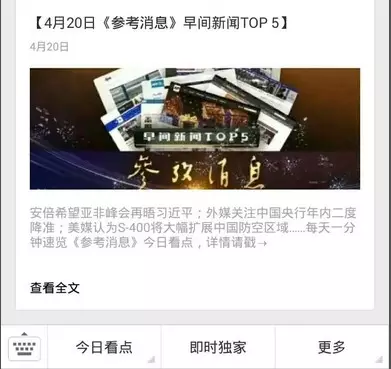 X:今日看点,是经过数据分析之后选出来的用户比较感兴趣的5个分类栏目。除了头条、军事、趣闻这种根据用户偏好自动推送的子栏目,还有我们专供微信的原创语音栏目“参考听听”,以及双语栏目。