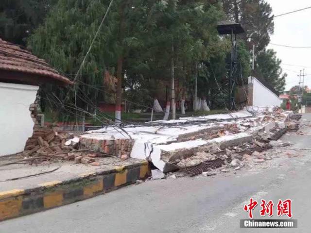路边围墙倒塌 (图片来源:中新社)