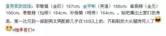 最典型的例子是《继承者们》,根据演员公开的官方数据计算,由李敏镐、金宇彬领衔的男演员阵营,妥妥的平均身高185。