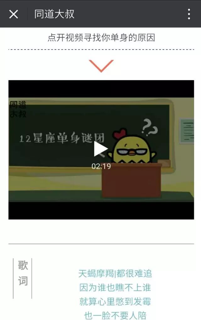 微信公众号“同道大叔”介绍直截了当,声称自己是“星座娱乐专家”、“少女之友”。的确,微信平台上的“同道大叔”发布的内容虽然同样是星座内容,但可以明显感觉到其用户风格倾向于女性。此外,由于不受字数限制,以及内容表现形式更为自由,微信平台上发布内容和形式显得更为丰富,例如短视频吐槽等。