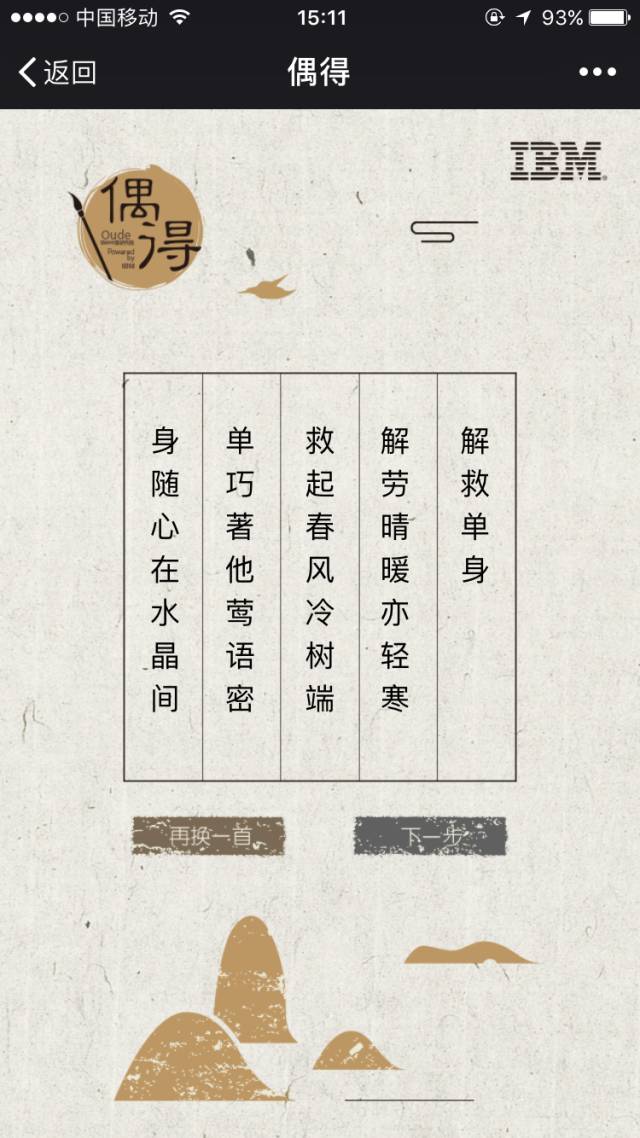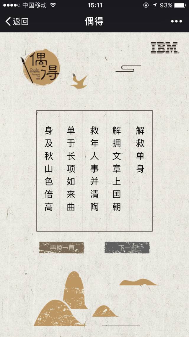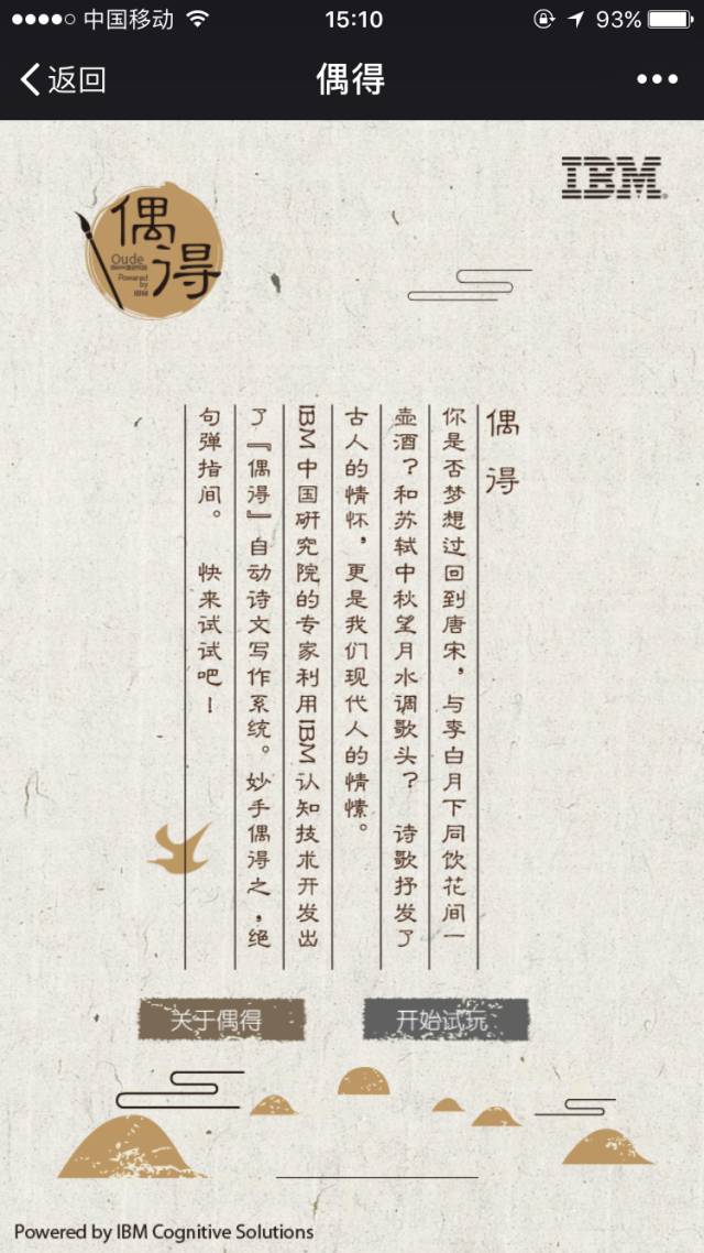 去年4月,IBM中国研究院也推出了一款“造诗机”,名唤“偶得”,取自陆游诗“文章本天成,妙手偶得之”。