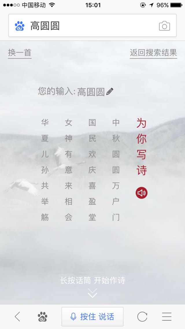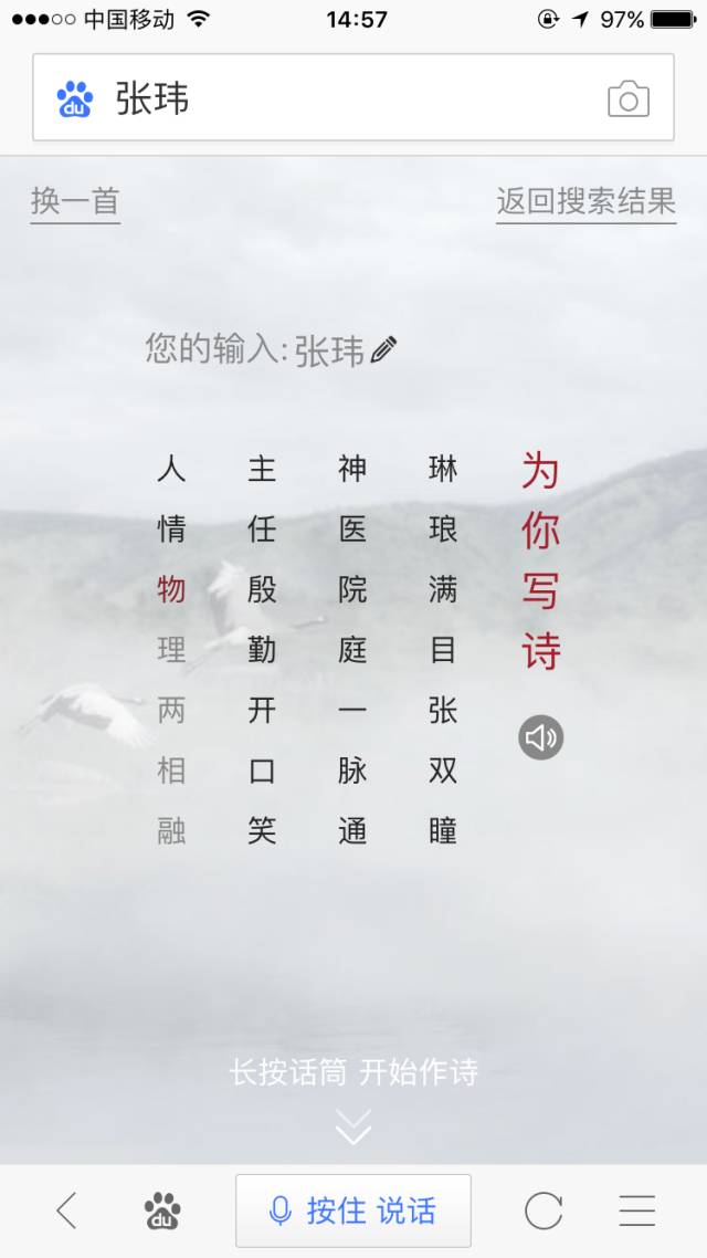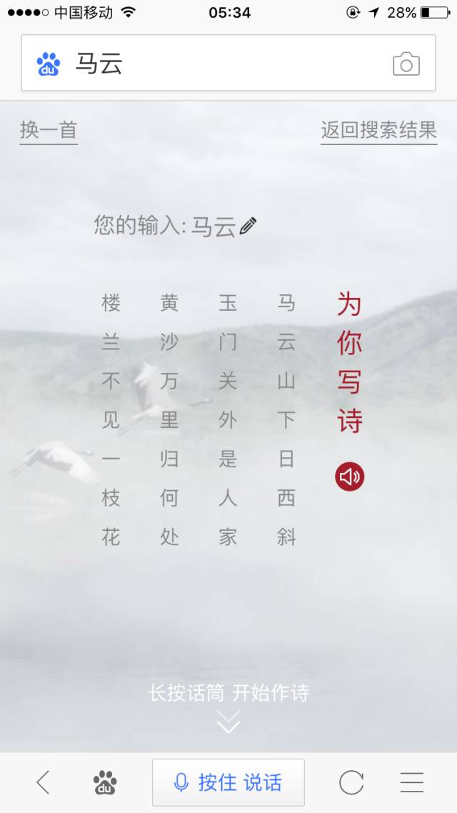 打开百度搜索APP,摁住下方语音按钮说一句“为你写诗”,就能进入写诗页面。再通过语音输入(之后可手动修改)关键词,一首七言绝句就自动生成了。