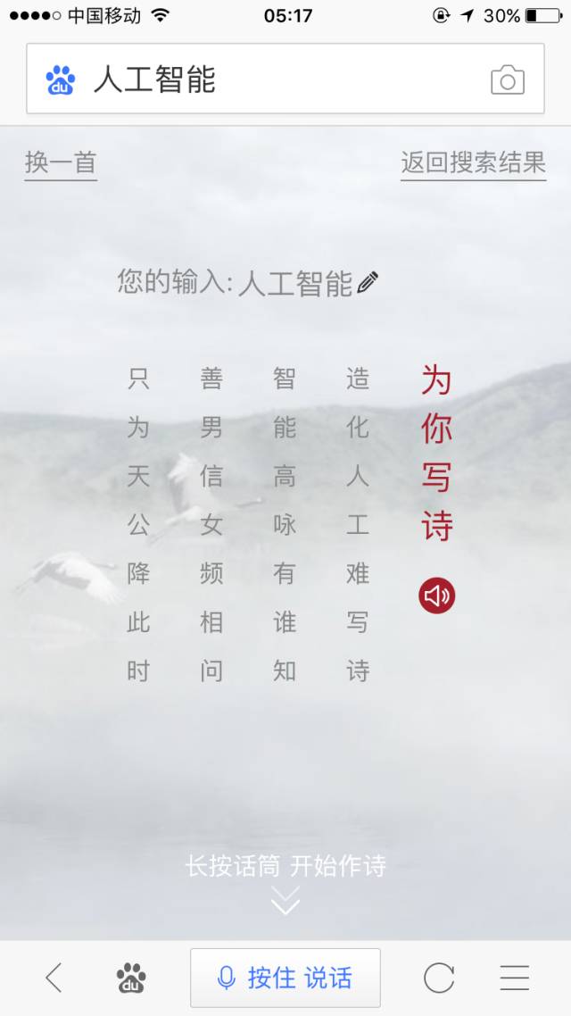 特别有意思的是,在百度的“为你写诗”中输入“人工智能”,得出这么两句:
