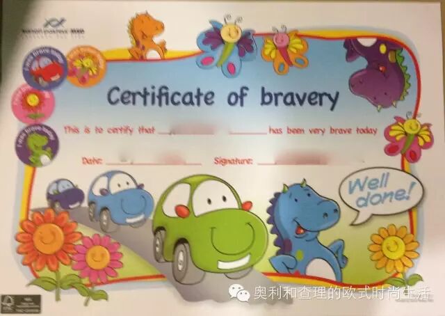 1)医疗上的“痛苦障眼法”:英国婴幼儿打预防针从几个月到三岁陆续打完。孩子几个月时我带着双胞胎一起去打,在孩子三岁时,医院要求必须要两个大人陪同。第一个孩子接种的时候,第二个孩子在门外等候。这样第二个孩子对于发生的事情全然不知。当我把奥利抱在腿上等待护士打针时,另外一个护士拿着一张彩色图片,绘声绘色地给奥利讲了起来,我在那看着直想笑,趁孩子不注意,第一针打完。奥利说了声有点疼,没想那个讲故事的护士更加手舞足蹈,我都快笑出声,这样又一针,第二个胳膊打完。最后给孩子颁发勇敢证书及奖励贴片,奥利还被夸得头都大了。整个过程,打针这个主要环节被其他乱七八糟的东西取代,这就是医疗“痛苦障眼法”,把痛苦缩小化。