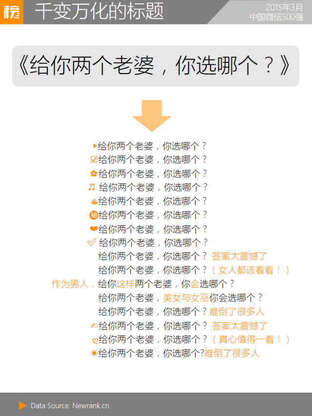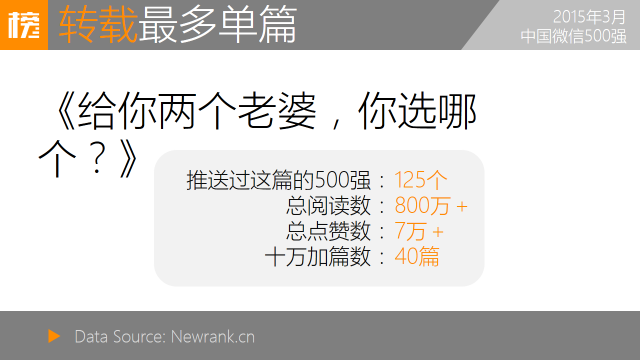 125个账号推送了《给你两个老婆,你选哪个?》一文,其中40篇阅读数达十万以上,总阅读数800万以上。
