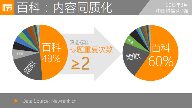在标题重复次数≥2的2756篇内容中,百科共1646篇,占60%;幽默589篇占21%;情感144篇,占5%;文化132篇,占4%;内容传播量巨大的内容中至少一半以上来自百科类,但这些内容并非优质原创,绝大多数为反复利用的无版权内容。由此可见,百科类账号内容同质化尤为严重。