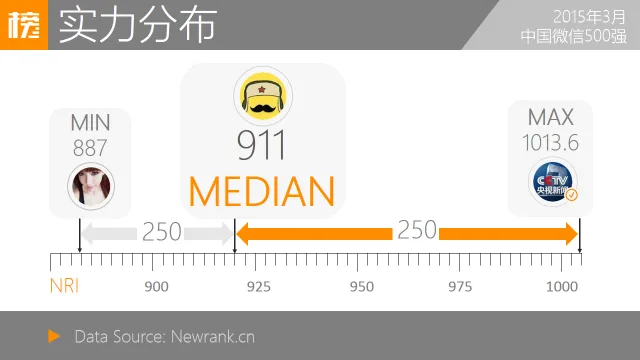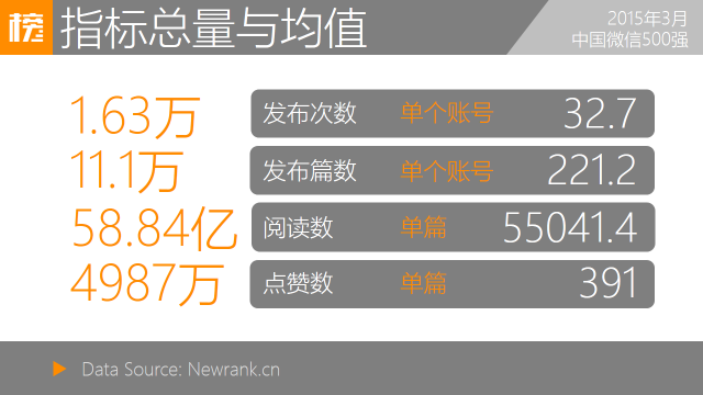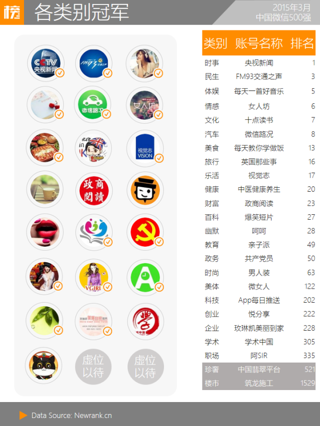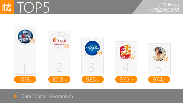 2015年3月,中国微信500强前五位为:央视新闻、人民日报、FM93交通之声、交通91.8与每天一首好音乐(微信号:HaoMM8)。央视新闻与人民日报以高发布数、高阅读数及高点赞数将新榜指数突破1000,蝉联冠亚军宝座;“FM93交通之声”与“交通91.8”均为杭州电台类账号,位列三四。