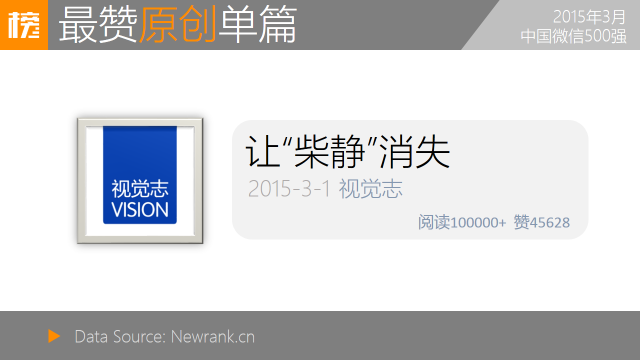 3月间,视觉志推送的《让“柴静”消失》获取45628次赞,单篇点赞总排名第二,是阅读及点赞排名前50以内唯一一篇讨论严肃时事的内容。这篇内容为乐活类账号视觉志运营者原创。庞大的受众基数与时下热点相互作用,突然改变账号内容定位的原创内容达到了惊人的传播效果。